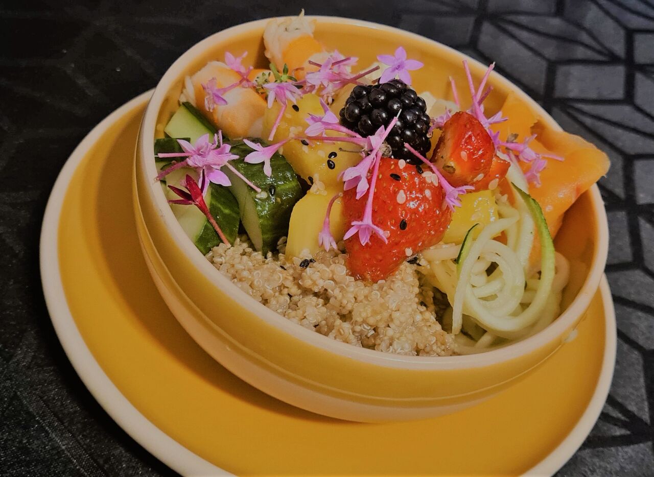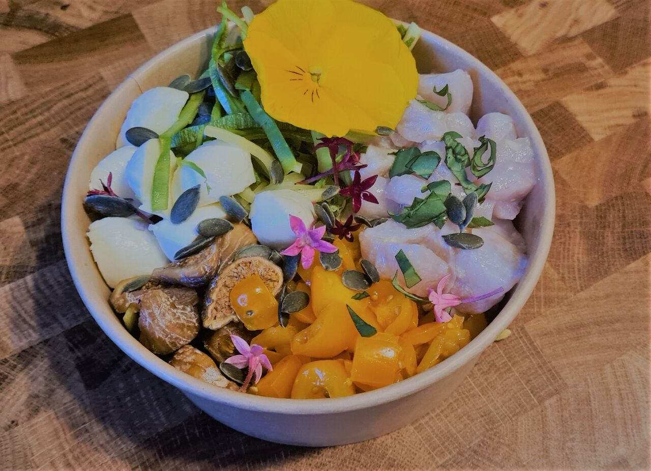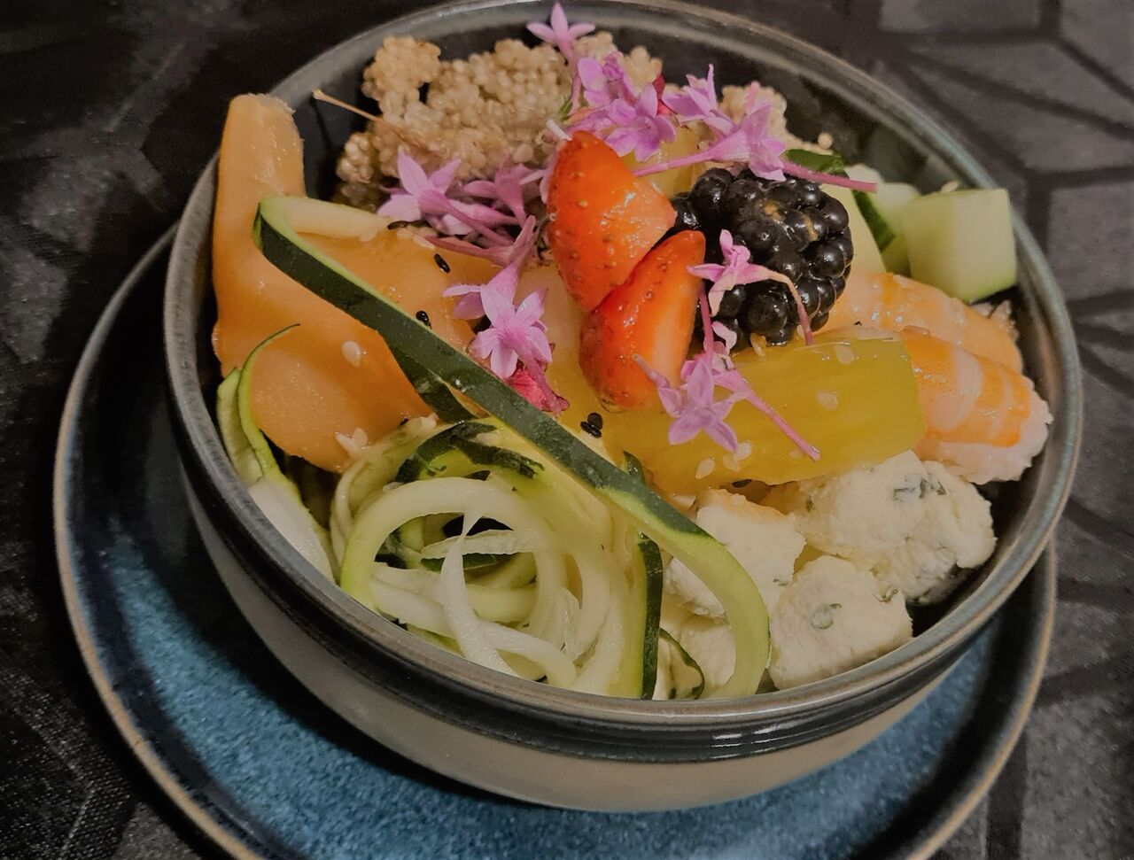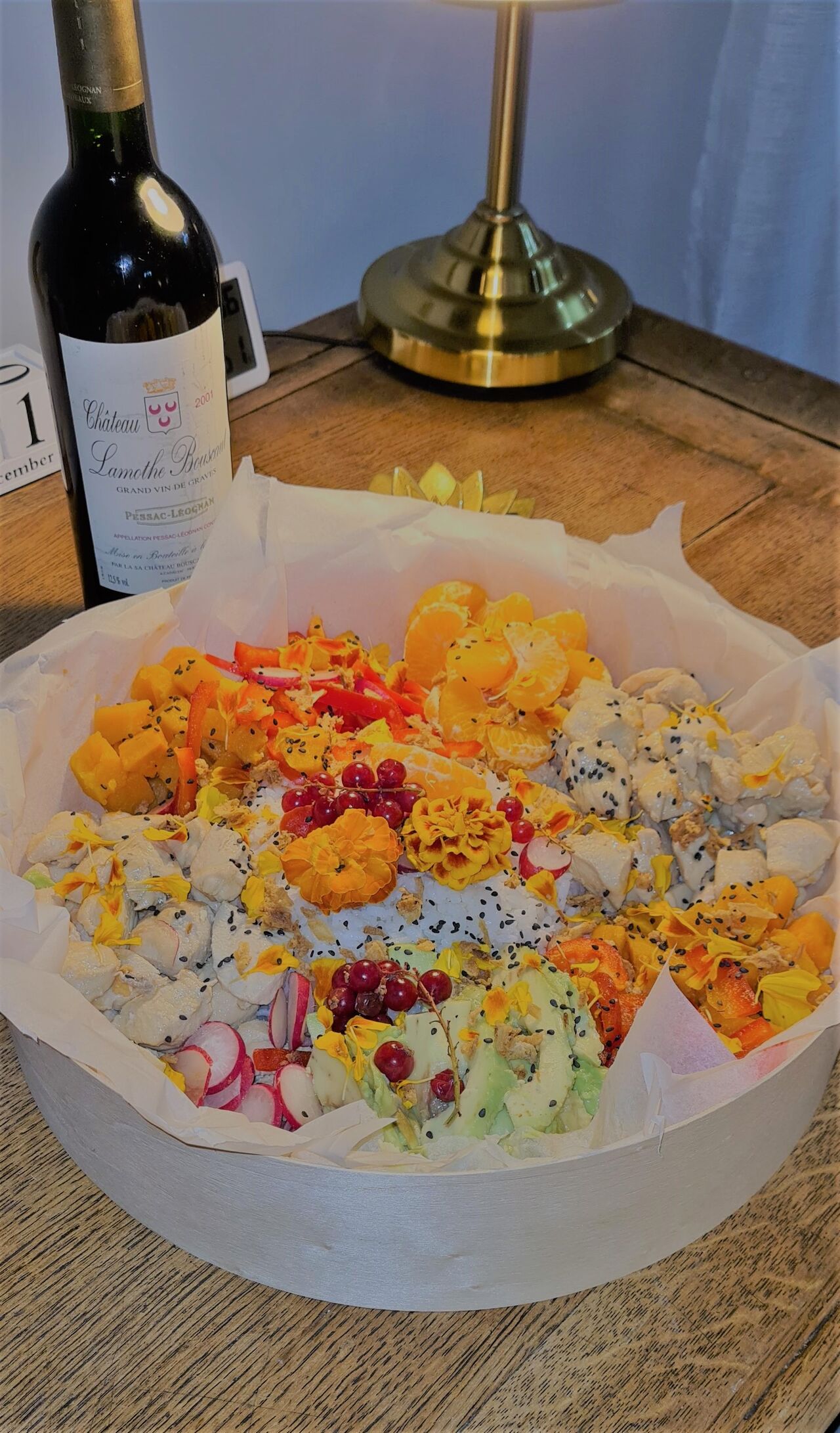 saumon fumé, crevettes, fraise, grenade, chou rouge, poivron rouge, radis rouge, tête de moine, fleurs comestibles