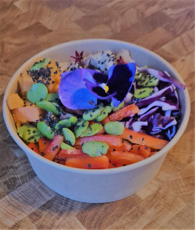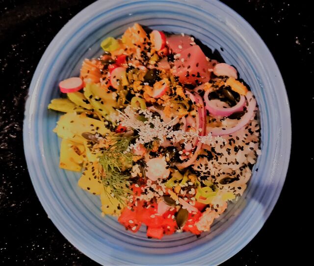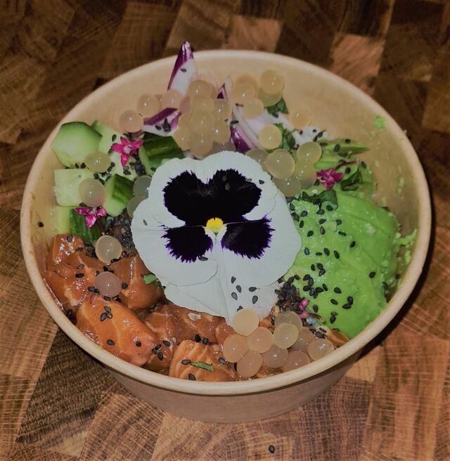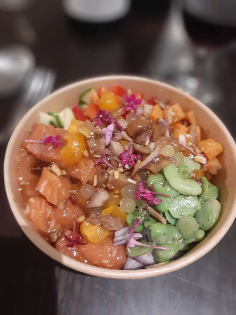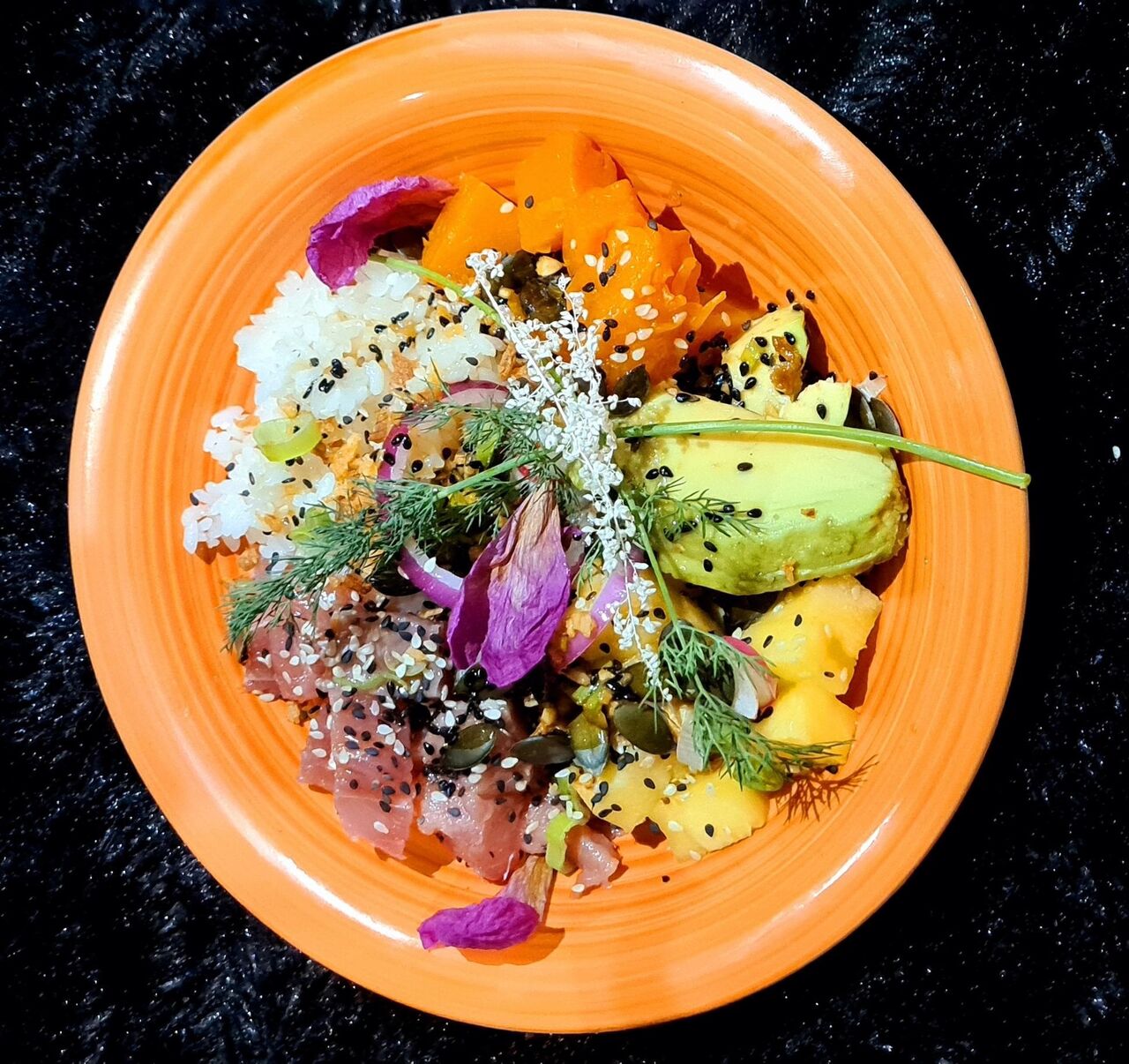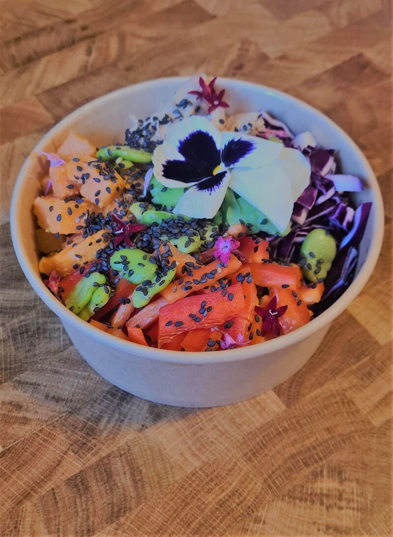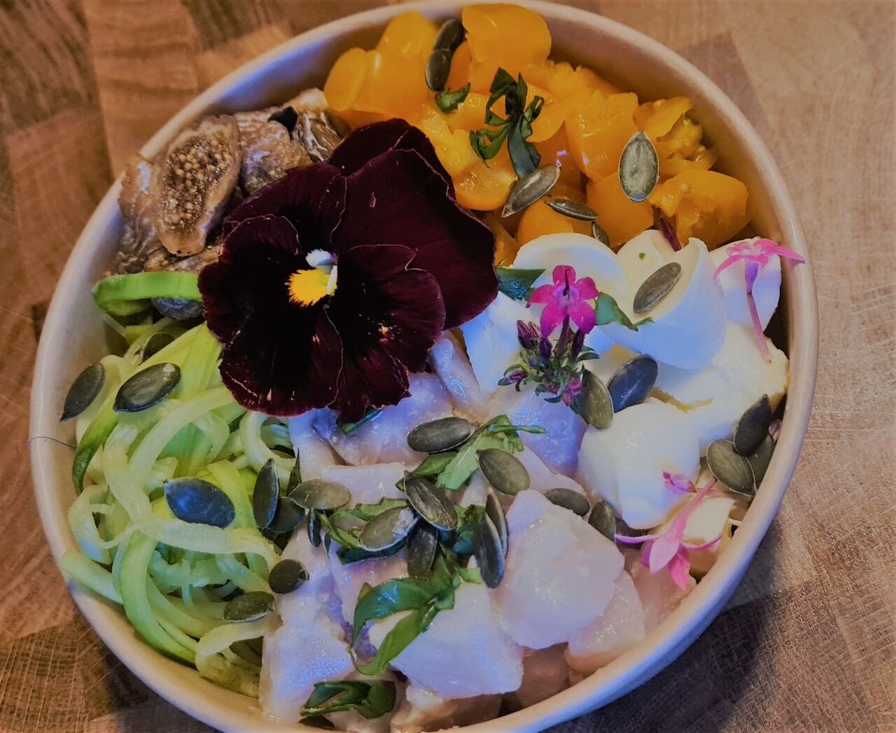 saumon fumé, crevettes, fraise, grenade, chou rouge, poivron rouge, radis rouge, tête de moine, fleurs comestibles